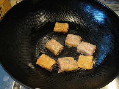 6、锅中放入少许油,油开后转中火,腐皮卷放入两面煎熟即可。