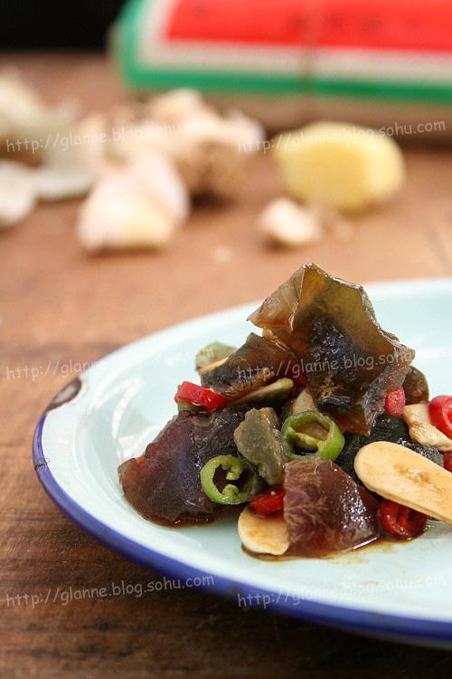 2.大蒜和姜分别切片,小尖椒切成小片,一起放入松花蛋中,然后加入酱油、白糖、盐、鸡精、高汤一起拌匀,放入冰箱腌制1小时;
