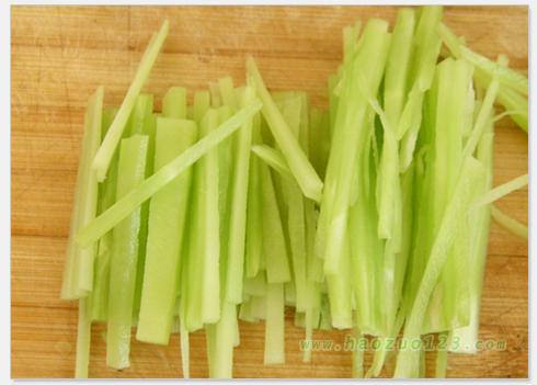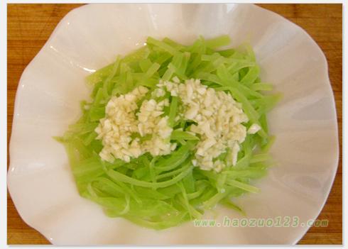 步骤3:莴笋丝放入沸水中焯一下,捞出过凉水浸凉,沥干水分后放入盘中。然后把准备好的蒜泥水倒在莴笋上。