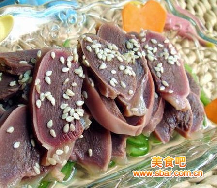 4 青椒切丝烫熟放盘中垫底,放上卤好的鸭胗,撒芝麻即可