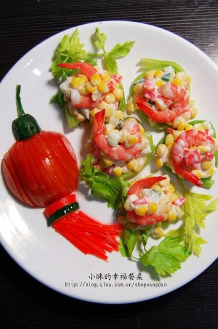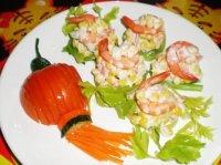 7、把做好的玉米沙拉放入芹菜圈内堆成一座座小金山,把基围虾放在金山上点缀;