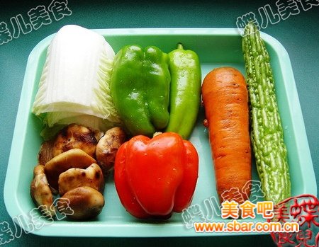 主料:白菜帮、胡萝卜、海带、香菇、青椒、红绿甜椒、苦瓜、豆腐干、银耳、黑木耳、青豆、花生米