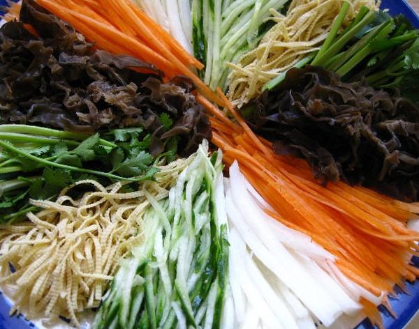 4、然后所有其他原料切丝儿码齐,这时候考验的是你的刀工和耐性,嫌麻烦就用插板插的