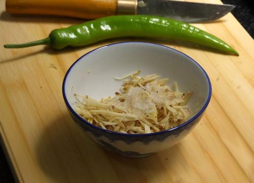 5:猪脚煮好后,下来就是沾料的制作,把生姜切成丝.