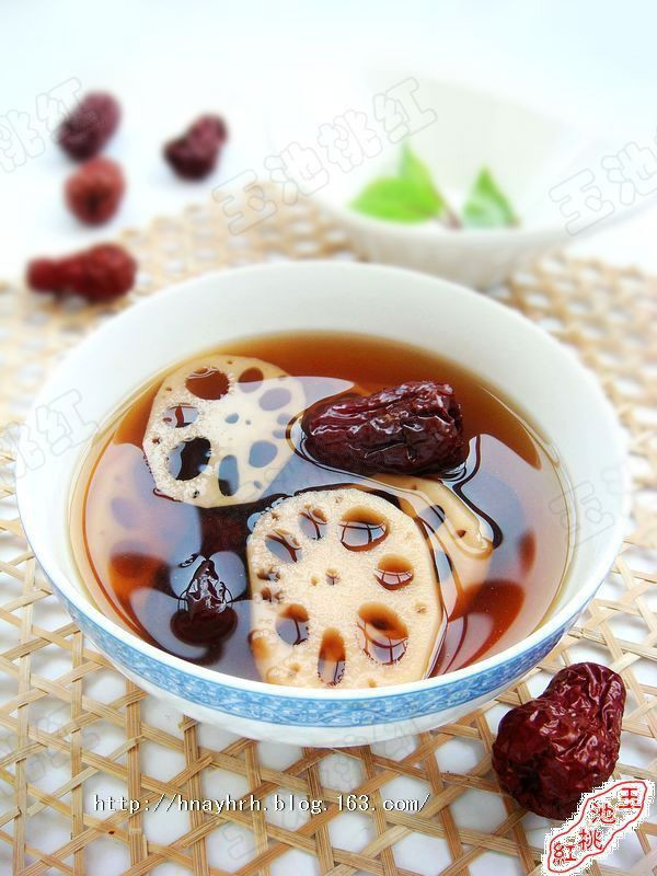 2、红枣用清水浸泡再洗净。莲藕削去外皮洗净后,切成5毫米厚的圆片。