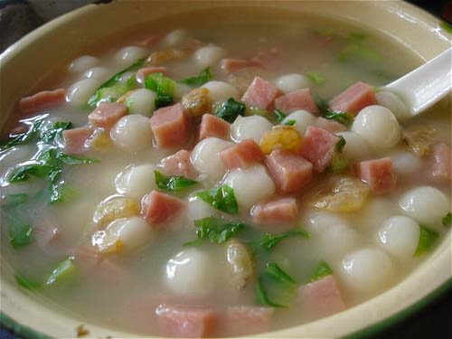 5、将高汤置火上,待水沸腾,放入除面粉以外的其它主配料。沸腾后均匀倒入已经搅好的面糊,用铲子推动使之不沾锅,沸腾后加入适量的配料即成。