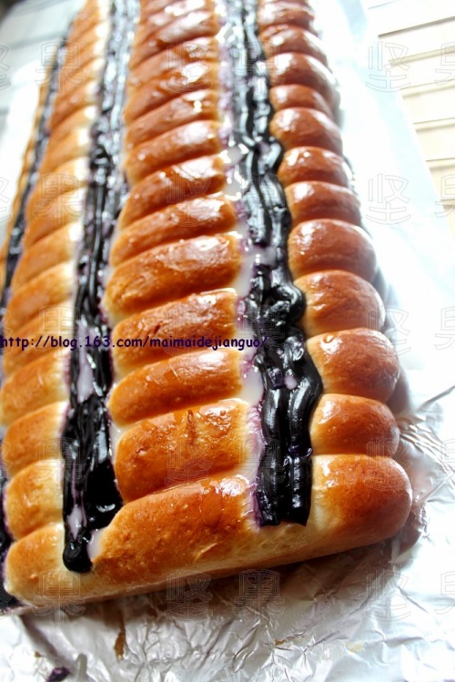 6.发酵结束后,刷上鸡蛋液,再挤上三条蓝莓酱