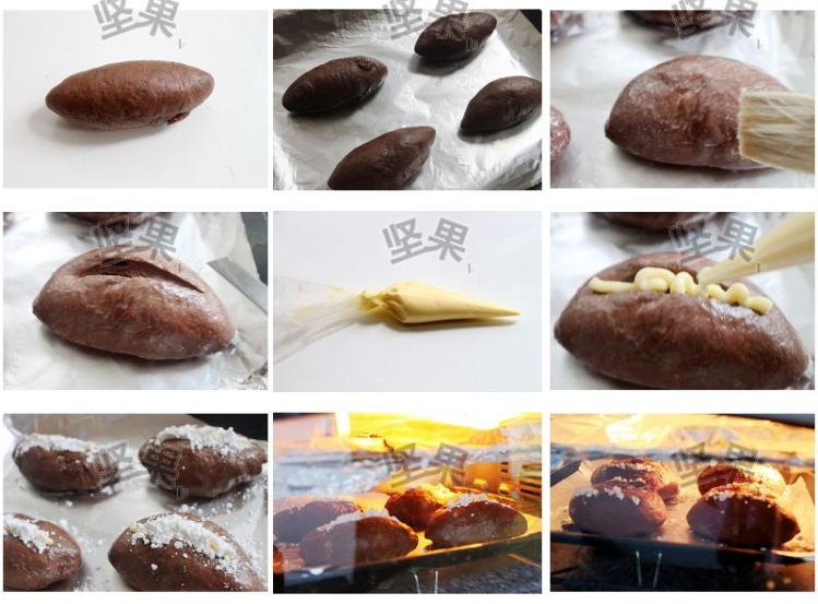 原料A:高粉200克,白糖20克,盐2.5克,酵母2.5克,鸡蛋1个,牛奶90克,黄油30克,可可粉1+1/2大匙