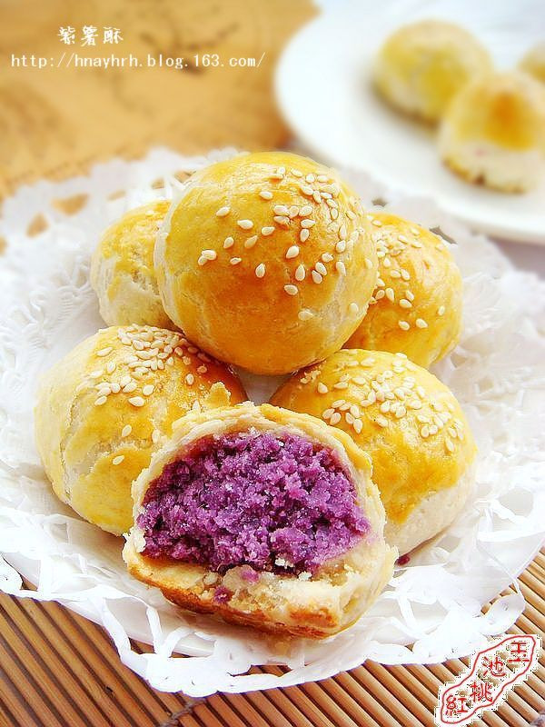 5、 取一只酥皮坯子,擀成片,包入豆沙馅,收口朝下摆入烤盘中,其它依次做好。