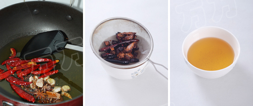 2.炸香油:锅里热大约150ml油,也可以稍微多加些,避免中间捞出调料时,油的损耗导致不够,而且,炸出的香油若剩余,用来炒菜或者凉拌菜味道都非常好。加入花椒10g,辣椒5g,八角,桂皮,山奈,小火慢炸10分钟至出香气,捞出调料,把花椒和辣椒切碎备用,油滤在碗里。