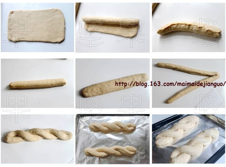 松弛结束后,入下图所示,整形成长圆柱型,用手稍稍按扁,对半切开(顶部留住不切断!),编成2股的麻花,再进行最后发酵30分钟,发酵结束后,均匀刷上杏仁酱,