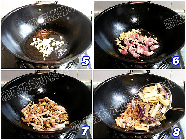 5.放入猪肉丁,小火煸炒至出油脂,(图6)放入咸鱼丁炒出香味,(图7)加入炸好的茄条。(图8)
