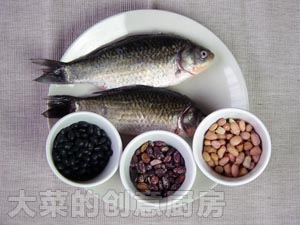 鲫鱼500克、黑豆150克、花生150克、红芸豆100克、盐适量