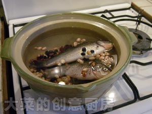 3, 在砂锅中放入足够多的清水(12小碗左右),将鲫鱼、黑豆、花生、红芸豆放入,大火烧开。