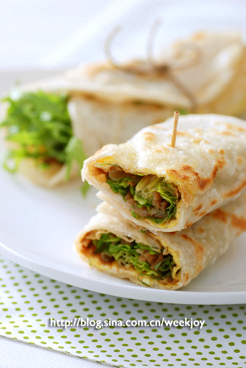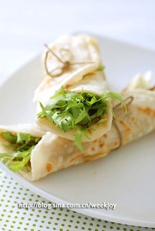 5.做好的饼外酥里嫩,配以生菜与酱,可加咸菜,非常好吃。
