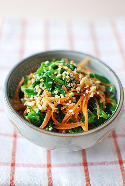 材料:豌豆尖300g,胡萝卜100g,花生碎和熟芝麻一大勺