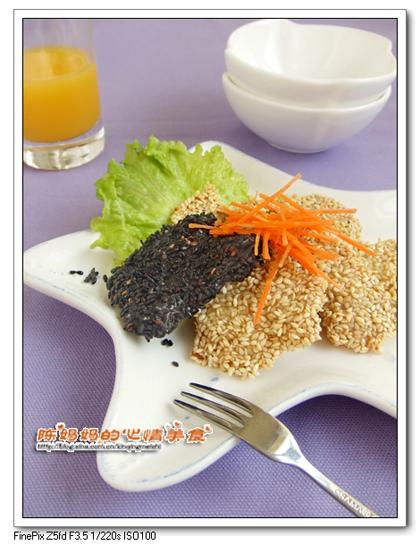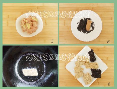 2、沾上黑芝麻的肉片不容易掌握火候,可以白、黑芝麻肉片同时炸,白的熟了,黑的也就熟了;