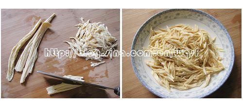 2、将干腐竹用冷水泡发,切斜刀成丝状备用。