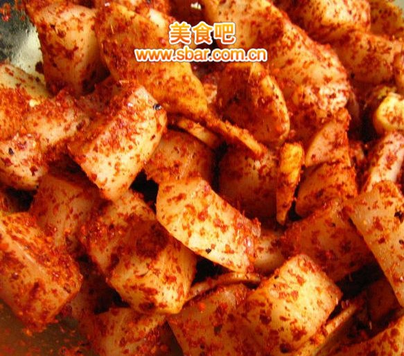 将萝卜 姜切块后,放入盐,腌至少半个小时让其出水后,加入辣椒面少许白醋搅拌后放入保鲜盒中(也可直接放入保鲜袋中)放入冰箱,两天之后就可享受美味了:)