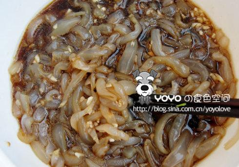 1、原料:1公斤海蜇皮(揉洗干净后,清水泡1个小时左右);调料汁:香油2勺、料酒1勺、香醋5大勺、白糖2勺、味精半勺、生抽4勺混合均匀;