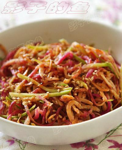 2、萝卜切细丝和小鱼干一起加辣椒酱、糖、麻油拌匀即可。洒上些炒熟的白芝麻,没有也可不加。