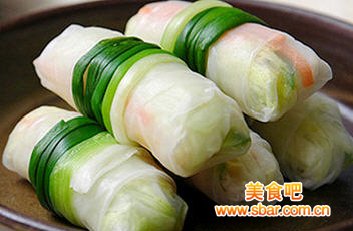 将rice paper浸在温水中,放在干净的砧板上,将蔬菜和乌僬?R的放在上面卷起来