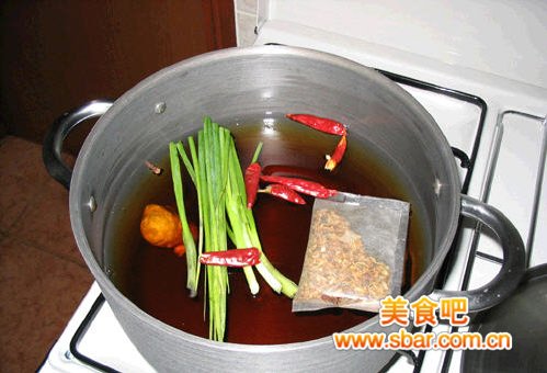 2.烧开一锅清水,放入卤水用料(见图),先大火烧开,然后用小火熬1小时,这就是卤水了。