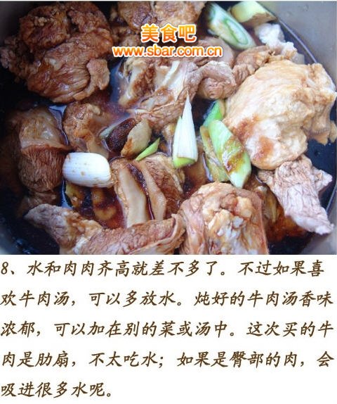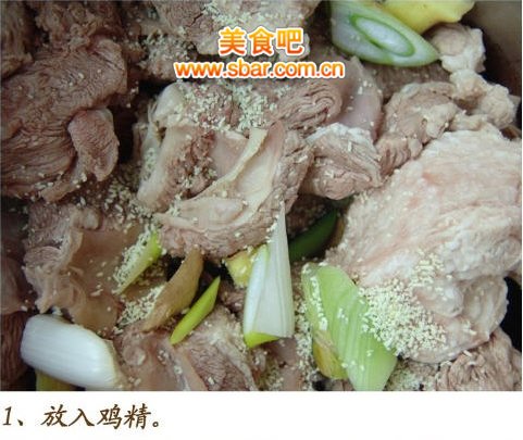 第一步:将牛肉飞水。将买来的牛肉洗净,切成拳头块。烧一锅水,等到水八成开的时候倒入些料酒,然后放入牛肉,等到肉变白色就可以了。注意千万不要等到水开了下肉,那样会使肉的组织一下子紧住,口感就不好了。飞过水的牛肉用温水洗一下,是这个样子的: