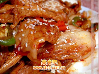 再重新加底油,下蒜片炸香后,下青红椒丝,略煸炒,下炒好五花肉片及泡菜,翻炒至入味,下葱段即可起锅,盛放在事先蒸好的豆腐上,再撒上熟芝麻即可。