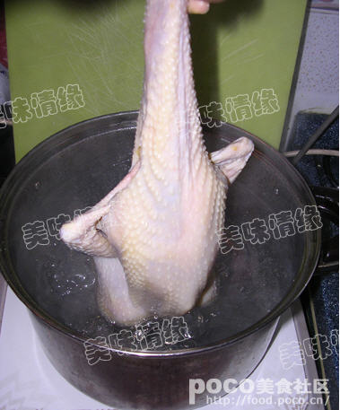 2、大火烧开煮锅中的水,提着鸡头部分把鸡身放入开水中反复烫3次
