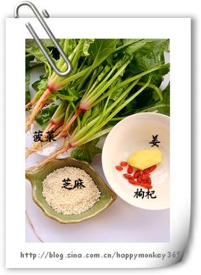 【原料】菠菜1把,芝麻1小碟,姜1小块,枸杞子适量(温水泡一泡)